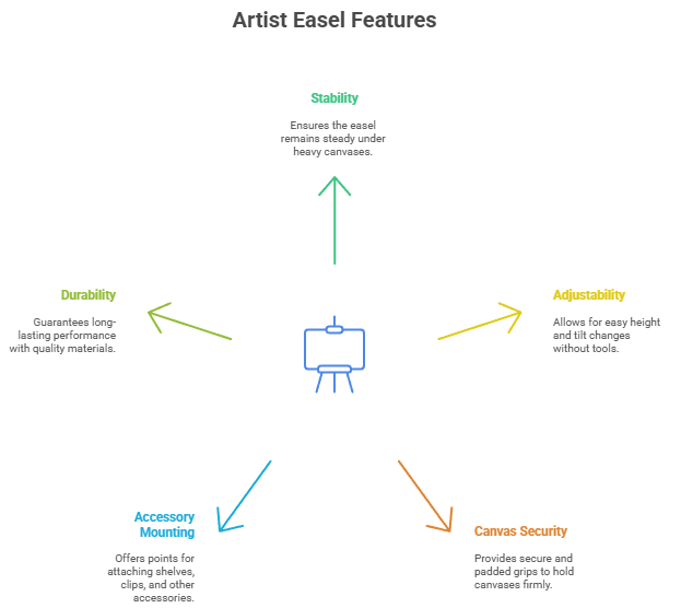 Key features of a quality easel include stability, smooth height and tilt control, and secure canvas grips that protect surfaces during vigorous work. A broad base and reliable locks matter more than extras. Comfort details, such as shelves, clips, and tidy tool management, keep attention focused on painting.