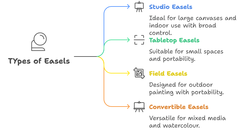 Most easels fall into the following categories: studio, tabletop, field/plein air, and convertible/hybrid. Each suits a different space, canvas size, and working style. Knowing the trade-offs makes it easy to shortlist what fits your practice.